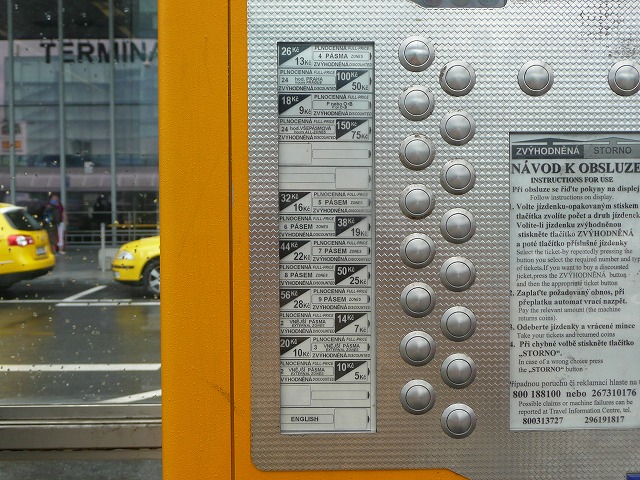 地球の歩き方などガイドブックでは、「きれいな車体」と書いてあり、写真も明らかに「市バス」とは違うものが載っていますが、実際に来たのは「市バス」に似た車体のこのバス。似ているというか、はっきり言って同じです。ガイドブックの車体をイメージして待っていたので、1本乗り遅れました。料金は50㌝で1日券(正確に言うと24時間券)100㌝では乗れません。値段も安いので、空港についたばかりの慣れていない状態では、市バスや地下鉄を乗り継いで市内中心やプラハ本駅まで行くよりも、早く簡単に行くにはお勧めです。