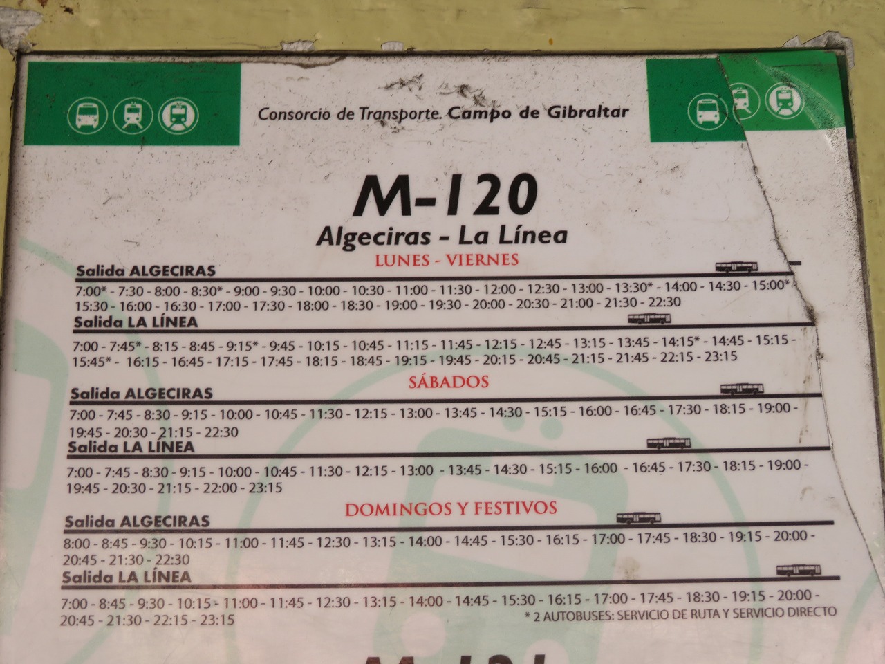 - バスはアルヘシラスから出ています。帰りはアルヘシラス経由のラ・リネア行きバスに乗りました。若干運賃は安くなるようですが、一日一本のみとかそのレベル。基本的にはアルヘシラスまで乗り、そこから別のバスでラ・リネア行きバスに乗ってください。切符売り場の人にダイレクトだと言われたので、ラ・リネアまで直通だと思っていましたが、結果からするとアルヘシラスで乗り換える必要がないバスという意味のようです。しかもバスが故障したため、結局アルヘシラスで乗り換えました。乗客は私含め二人のみ。僅かな運賃だけのために、わざわざ待ってまで狙うバスではないというのが私の結論です。